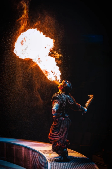 “本次升級,我們采用“天幕地屏+激光投影”的立體舞臺設計,打破了傳統演出的空間限制,給觀眾帶來前所未有的沉浸式體驗。”導演閔銳接受采訪時說,“《王的戰車》以北方部落的古老傳說為藍本,將傳統技藝與現代科技巧妙融合。比如縵吊演員的表演象征著部落信仰的升華,而噴火表演則象征著勇士的熾熱斗志。整場演出既保留了傳統雜技的力量與驚險,又通過全息投影技術等科技手段賦予其全新的藝術表達,希望觀眾在觀演的過程中,除了感受到震撼,也能體會到中國傳統文化的深厚底蘊與傳承。